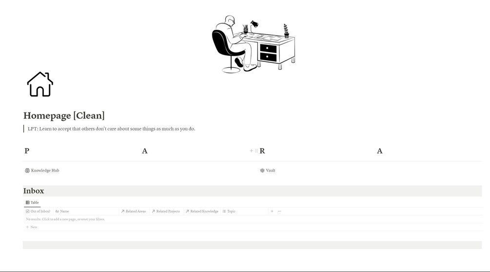 There are 4 main databases [Projects 🐲, Areas ☯️, Resources 💡, Archives 📂], with a separate Knowledge Hub for all the bookmarks of articles that you save.
